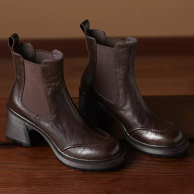Bring a rebellious edge to your wardrobe with these stunning sheepskin leather Chelsea boots. Designed for women who love confidence and comfort, these ankle boots combine a classic round toe with modern patchwork detail and a striking 2.7 inch chunky heel. The slip-on elastic sides make them easy to wear, while the platform sole delivers both stability and fashion-forward flair. Perfect for autumn, they’re the kind of boots that turn every step into a statement.
