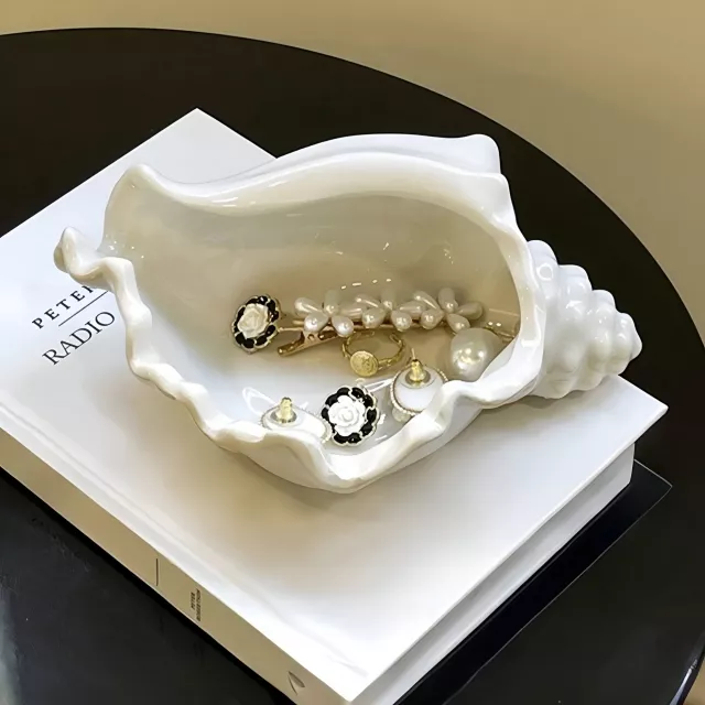 Made from high-quality ceramic and enamel, this elegant tray features a glossy finish that showcases its intricate shell design. Measuring approximately 12 inches in length, it provides ample space for your favorite items. The unique conch shape not only adds an artistic flair but also makes this tray a striking focal point in any room. Whether placed on a coffee table, dresser, or kitchen counter, it effortlessly elevates the aesthetic of your home.