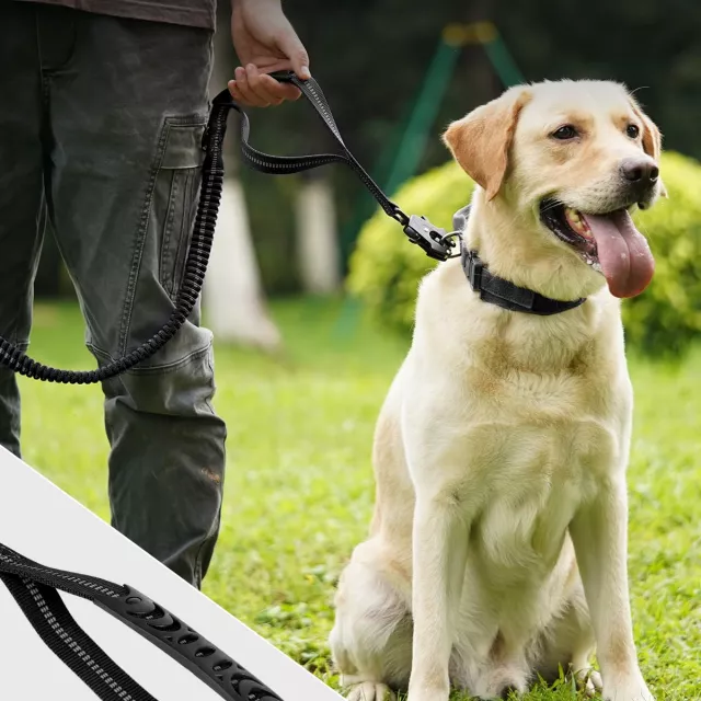 This tactical leash is engineered with a super-strong aviation aluminum Frog Clip that locks securely yet releases quickly when you need it. The clip rotates 360° to prevent tangles, making every walk smoother. It also includes two padded handles for versatile control: a soft padded handle at the end for relaxed walking, and a traffic handle closer to your dog for tight, controlled guidance in crowded or high-traffic areas. The shock-absorbing bungee design reduces strain by stretching naturally to ease pulling pressure. Reflective stitching adds safety at night, and the built-in seatbelt attachment keeps your pup secure during car rides.