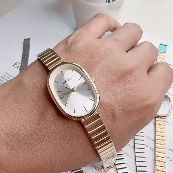 Our watch boasts a unique oval-shaped case, elegantly crafted to fit the contours of your wrist. The sleek alloy case, measuring 23mm in diameter and 8mm in thickness, houses a reliable quartz movement, ensuring accurate timekeeping.